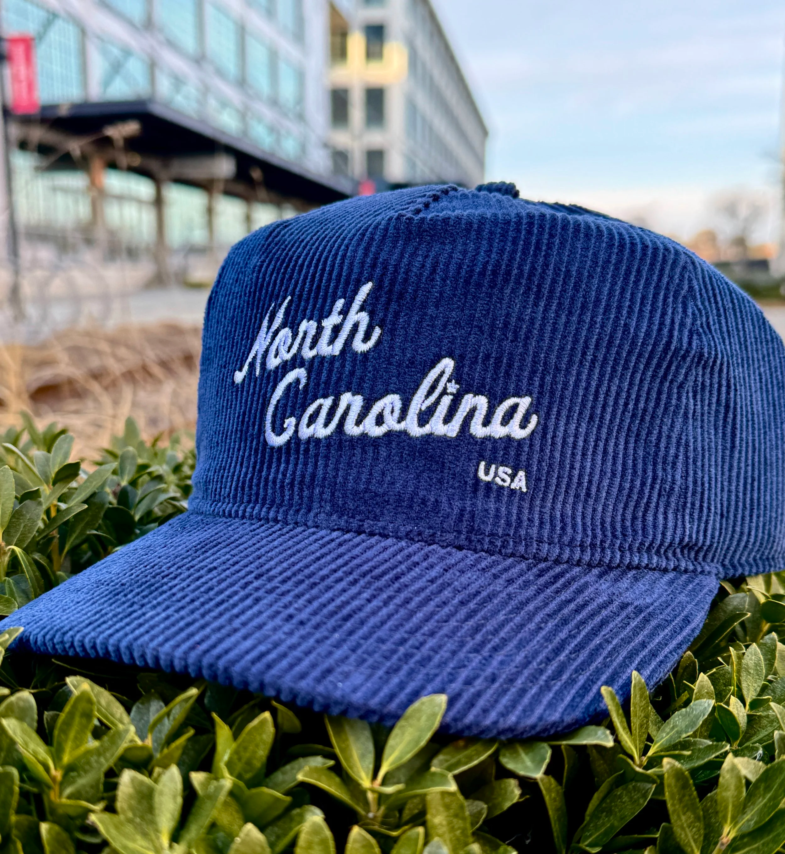 Introducing the North Carolina USA Corduroy Snapback, a vintage-inspired accessory that blends style and heritage. This 5-panel snapback features a white embroidered North Carolina face, exuding a timeless charm. Perfect for those seeking a touch of nostalgia. Available in multiple colors, twilight navy blue (pictured).